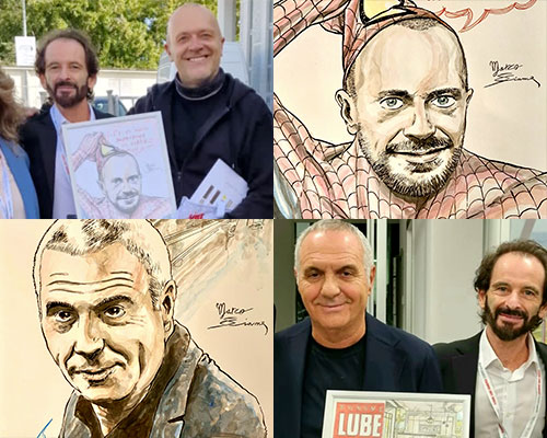 La consegna a Max Pezzali e Giorgio Panariello delle rispettive opere di Marco SCIAME in occasione della recente Convention LUBE.
